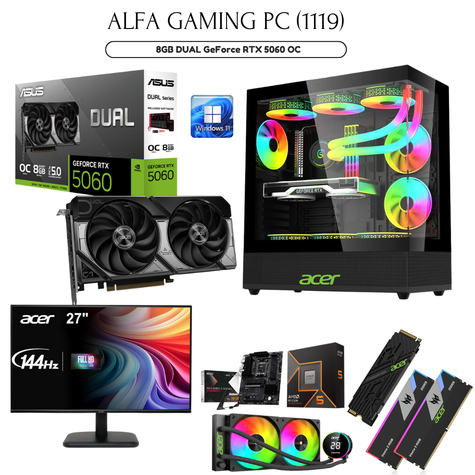 - جهاز ألعاب ألفا PC 1119 AMD 9600X، 8GB RTX5060، 32GB RAM، 2TB SSD، شاشة Acer 27 بوصة 144Hz، هيكل Acer V930B، ويندوز 11 برو