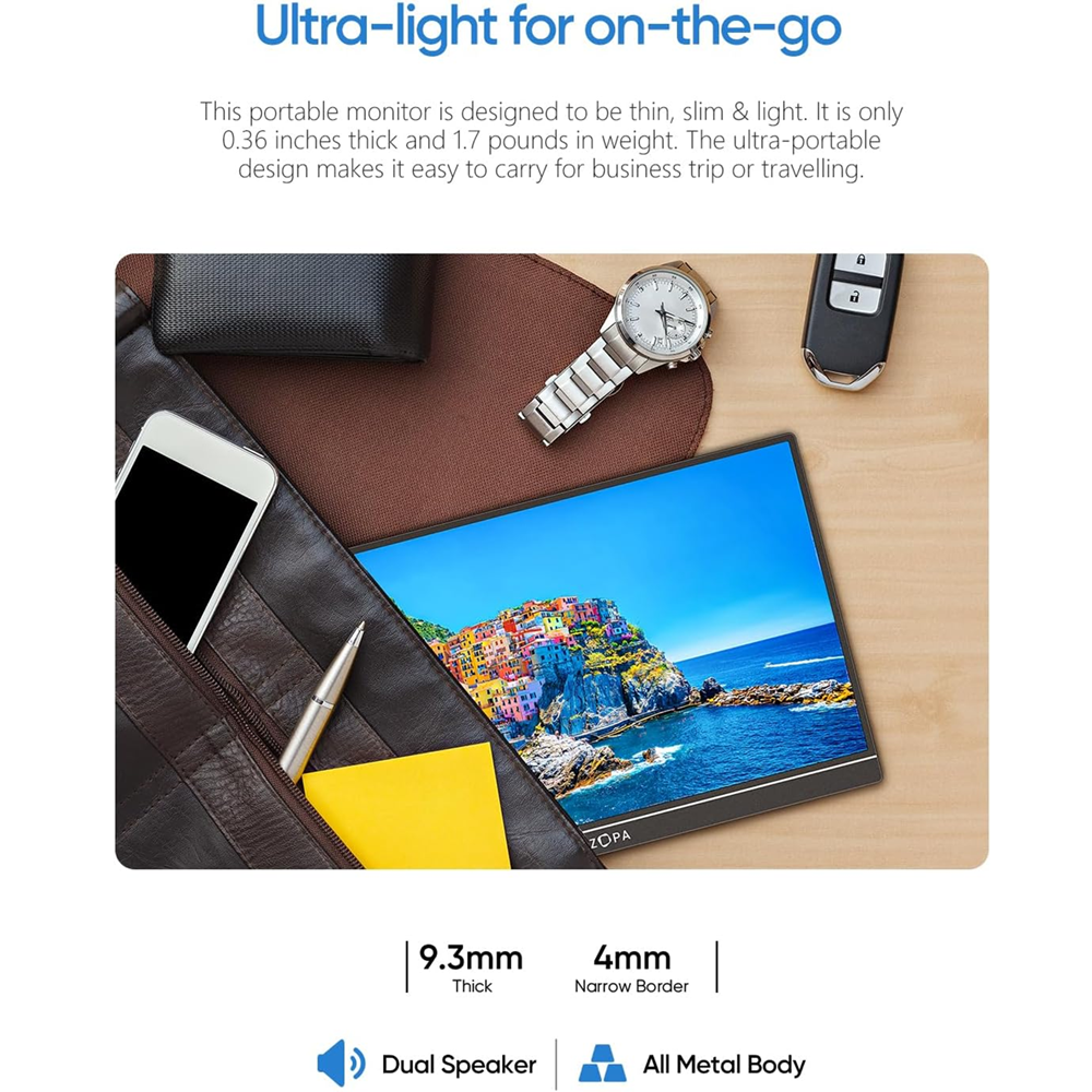 Arzopa شاشة نحيفة وخفيفة وقابلة للحمل مقاس 16.1 بوصة دقة FHD ‏(1920 × 1080)، نوع اللوحة: IPS وزن 780 غرامًا فقط (1.7 رطل) | نحافة 9.3 ملم