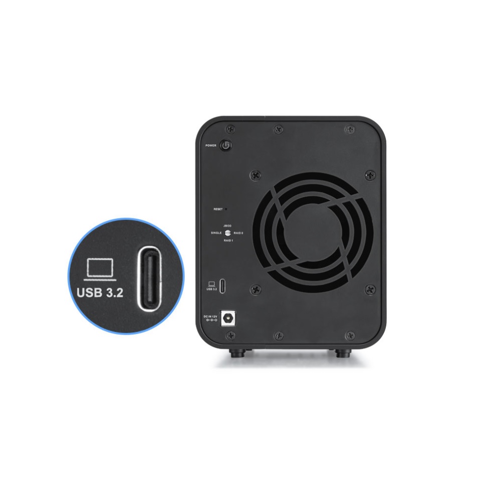 D2-320 supports up to 2 hard drives and a maximum drive capacity of 22TB (the compatibility with larger hard drives not verified yet), providing users with a storage space up to 44TB (22TB x 2).