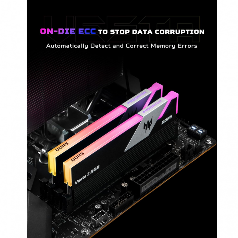 Take your gaming and computer experience to new heights with the latest generation of DDR: Acer Predator Vesta II DDR5 lets you run at MAX 7200 MHz. It’s blazing fast but also a top-notch performer with sleek design, ultra-low timings, customizable RGB lighting and stylish metallic heat sink. Built with quality components, Vesta II DDR5 features on-die Error Correction, the latest in one-click overclocking and PMIC (programmable Power managment IC).