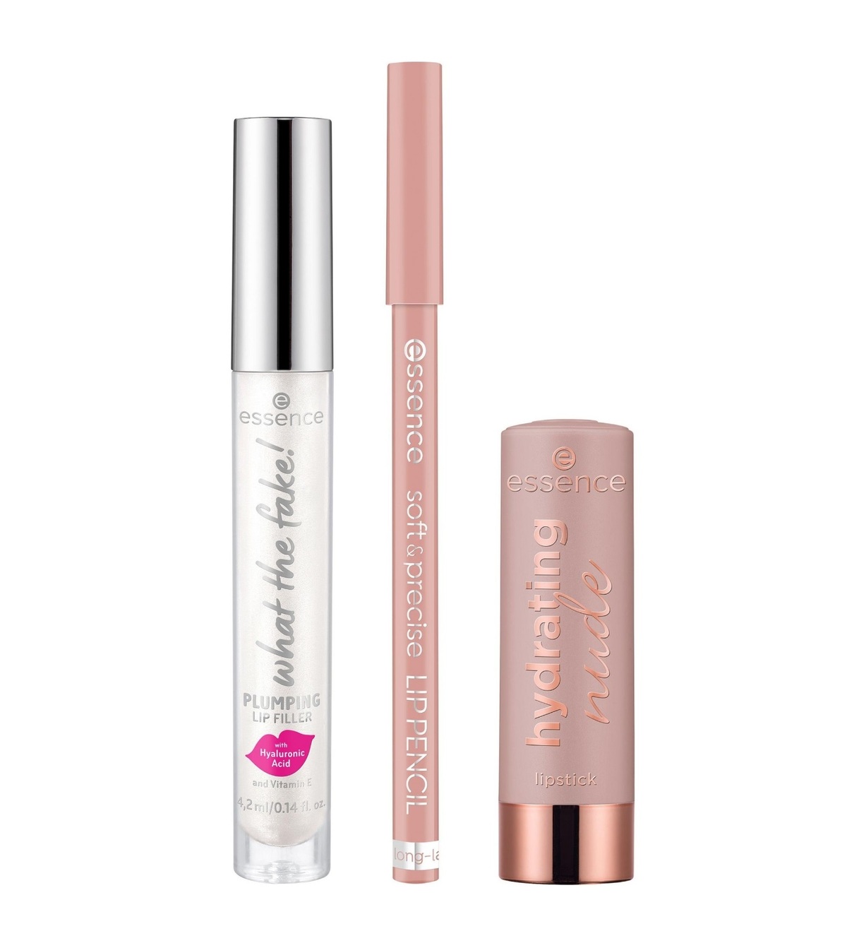The super-soft Beauty Sponge perfectly applies and blends creamy and pSet includes: 1x lip liner 0.78 g, 1x lipstick 3.5 g, 1x lip gloss 4.2 ml Lip Pencil and lipstick in natural nude High shine and volume thanks to lip glossThe Nude Lip Set Heavenly gift set from essence ensures beautifully made-up lips. The set contains a lip pencil, which outlines the lip contour with a soft tone. The lips can be filled in with the moisturizing lipstick in a delicate pink. The what the fake! Plump Lip filler ensures a shiny and voluminous result. For high-gloss and precisely made-up lips.owdery textures. When it comes into contact with heat, the black sponge magically turns a shade of pink – and back to black again, depending on the temperature.