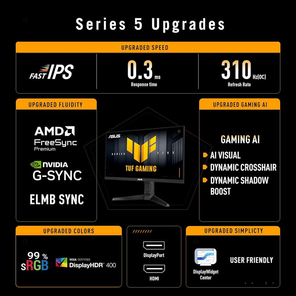 ASUS Panel Type : Fast IPS Resolution : 1920×1080 Refresh Rate (Max) : 310Hz (OC) Response Time : 1ms(GTG), 0.3ms(min.) Dual HDMI 2.0 / DisplayPort 1.4 x 1 (HBR2) / Speaker