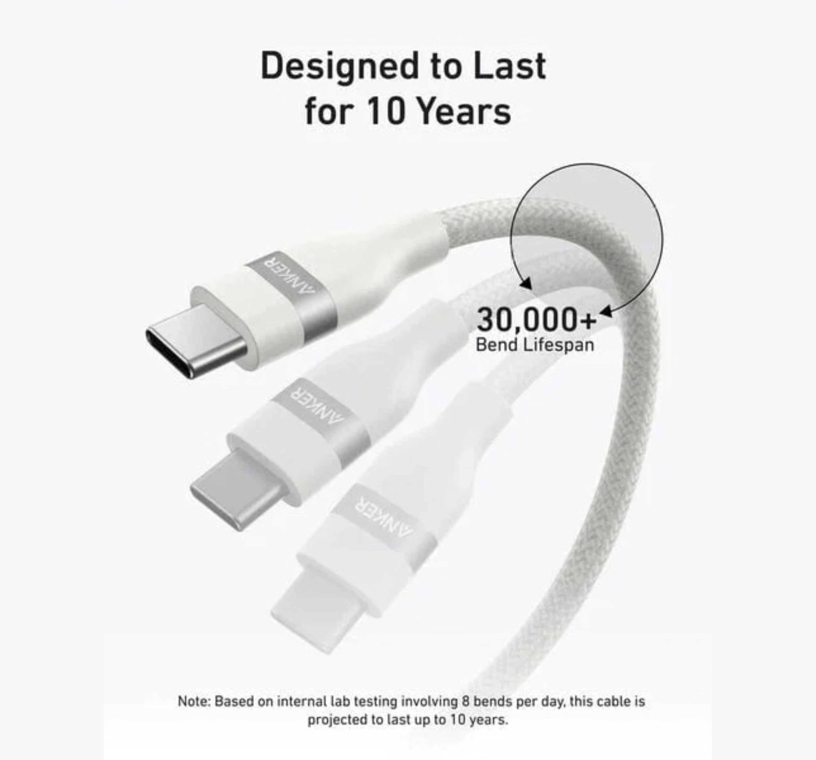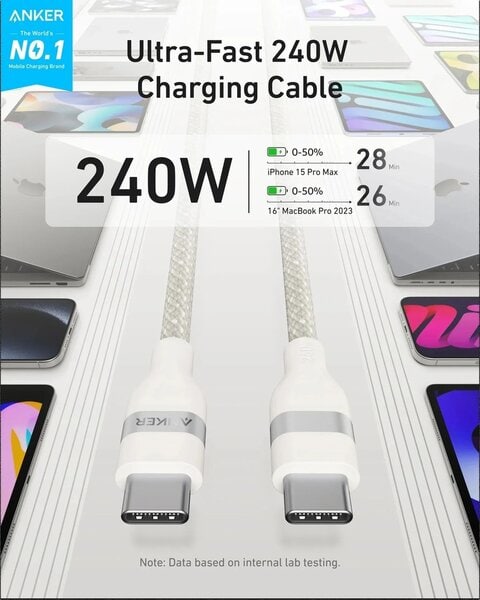 This 240W USB-IF certified cable can charge your 16-inch MacBook Pro (2023) to 50% in just 28 minutes or your iPhone 15 Pro to 50% in 26 minutes. Soft to the Touch, Simple to Store: This cable combines a soft touch with easy storage for knot-free charging sessions without the fuss. Ultra-Durable Charging Cable: With a 30,000+ bend lifespan and the ability to withstand 220 lbs without breaking, this cable is built to last over 10 years. Charge Sustainably: Crafted from 100% post-consumer recycled materials, the braided exterior combines eco-friendliness with high performance.