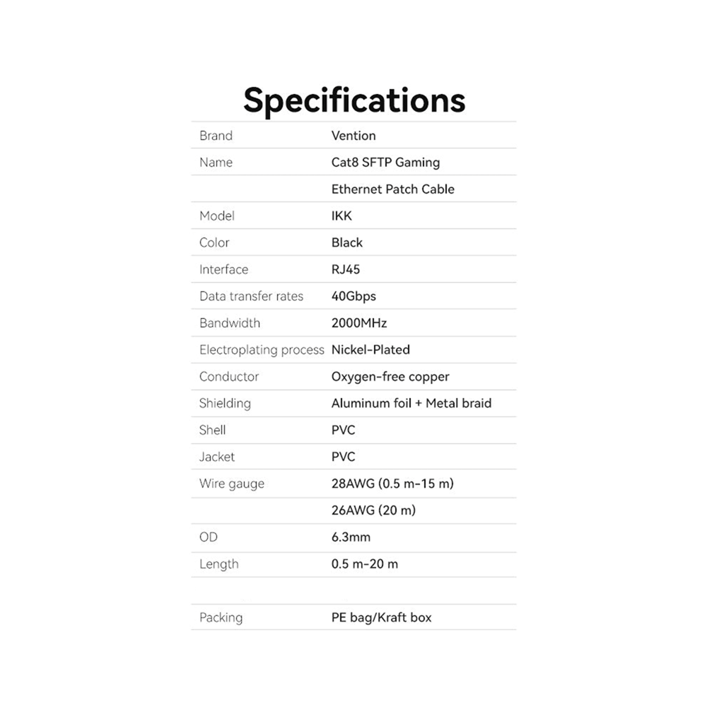 Vention Cat8 Bandwidth: 2000MHz Data Transfer Rates: 40Gbps Shielding: Aluminum foil + Metal braid